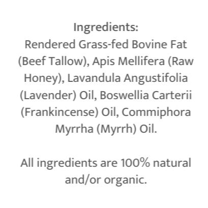 Rendered Grass-fed Bovine Fat (Beef Tallow), Apis Mellifera (Raw Honey), Lavandula Angustifolia (Lavender) Oil, Boswellia Carterii (Frankincense) Oil, Commiphora Myrrha (Myrrh) Oil.