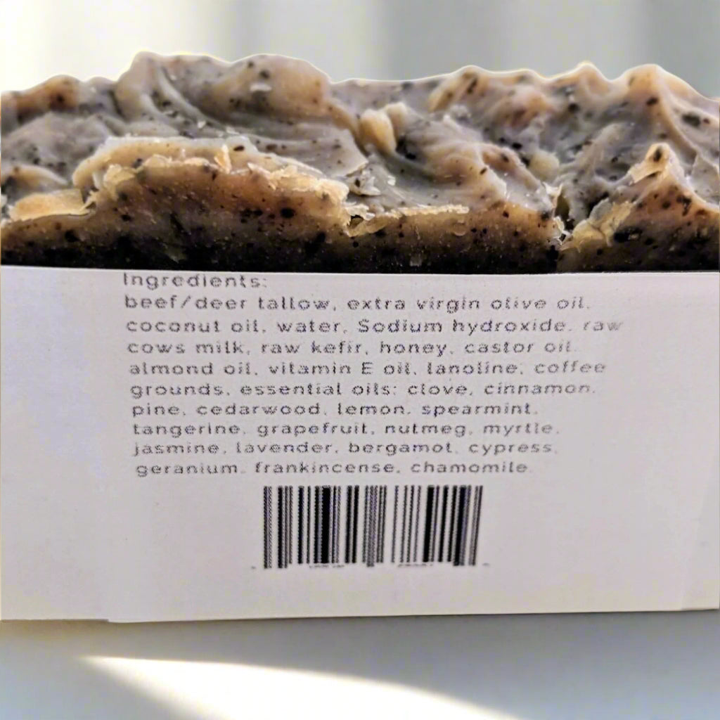 Beef/Deer Tallow, Extra Virgin Olive Oil, Coconut Oil, Water, Sodium Hydroxide, Raw Cows Milk, Raw Kefir, Raw Honey, Castor Oil. Almond Oil, Vitamin E Oil, Lanoline, Coffee Grounds, Essential Oils: Clove, Cinnamon, Pine, Cedarwood, Lemon, Spearmint, Tangerine, Grapefruit, Nutmeg, Myrtle, Jasmine, Lavender, Bergamot, Cypress, Geranium, Frankincense, Chamomile.
