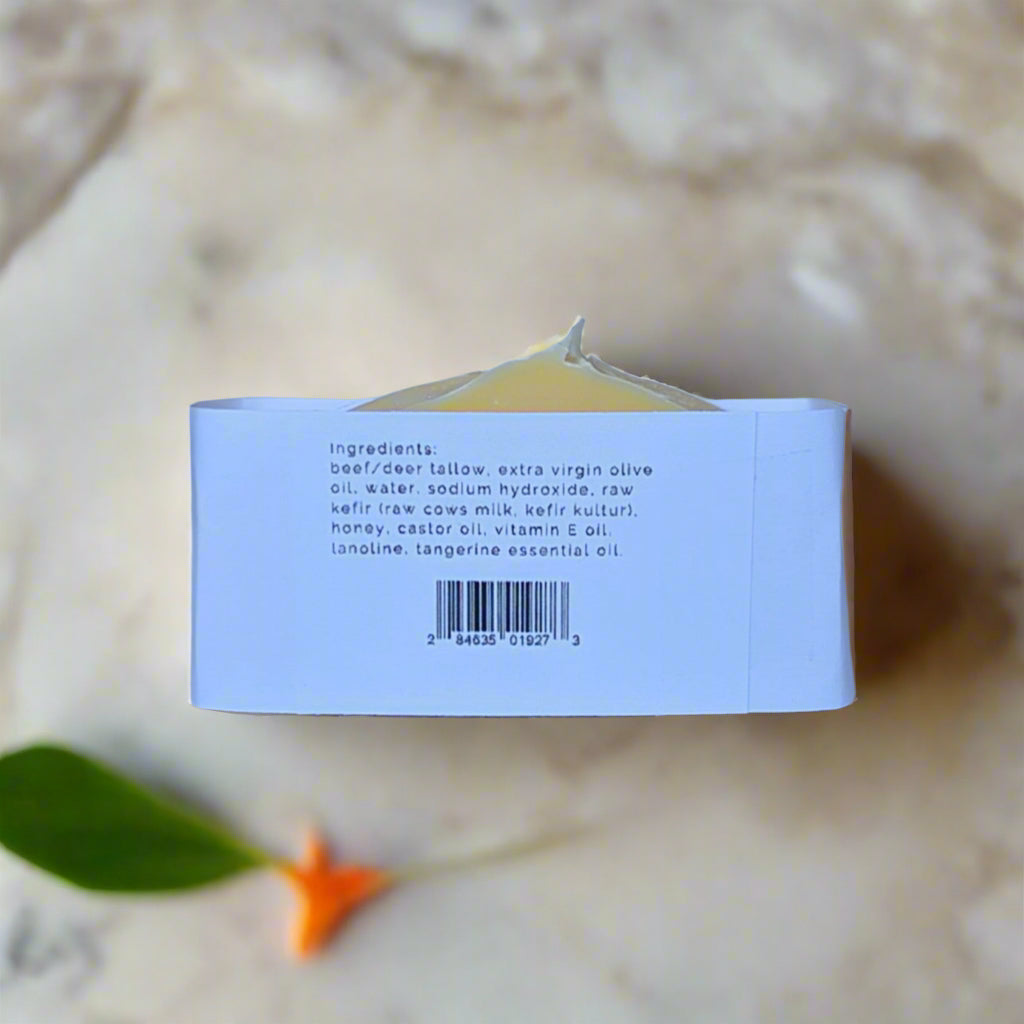 Beef/Deer Tallow, Extra Virgin Olive Oil, Water, Sodium Hydroxide, Raw Kefir, Raw Honey, Castor Oil. Vitamin E Oil, Lanoline, Tangerine Essential Oil.